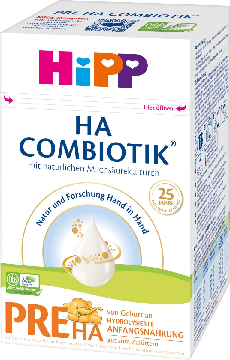 Hipp Pre HA Combiotik Infant Formula from birth is the latest generation of HA nutrition with hydrolyzed protein and a unique combination of ingredients. It contains natural lactic acid cultures, LCP (Omega-3 and -6), and fiber (GOS). It contains only lactose, allowing you to feed your baby as often and as much as they want.
